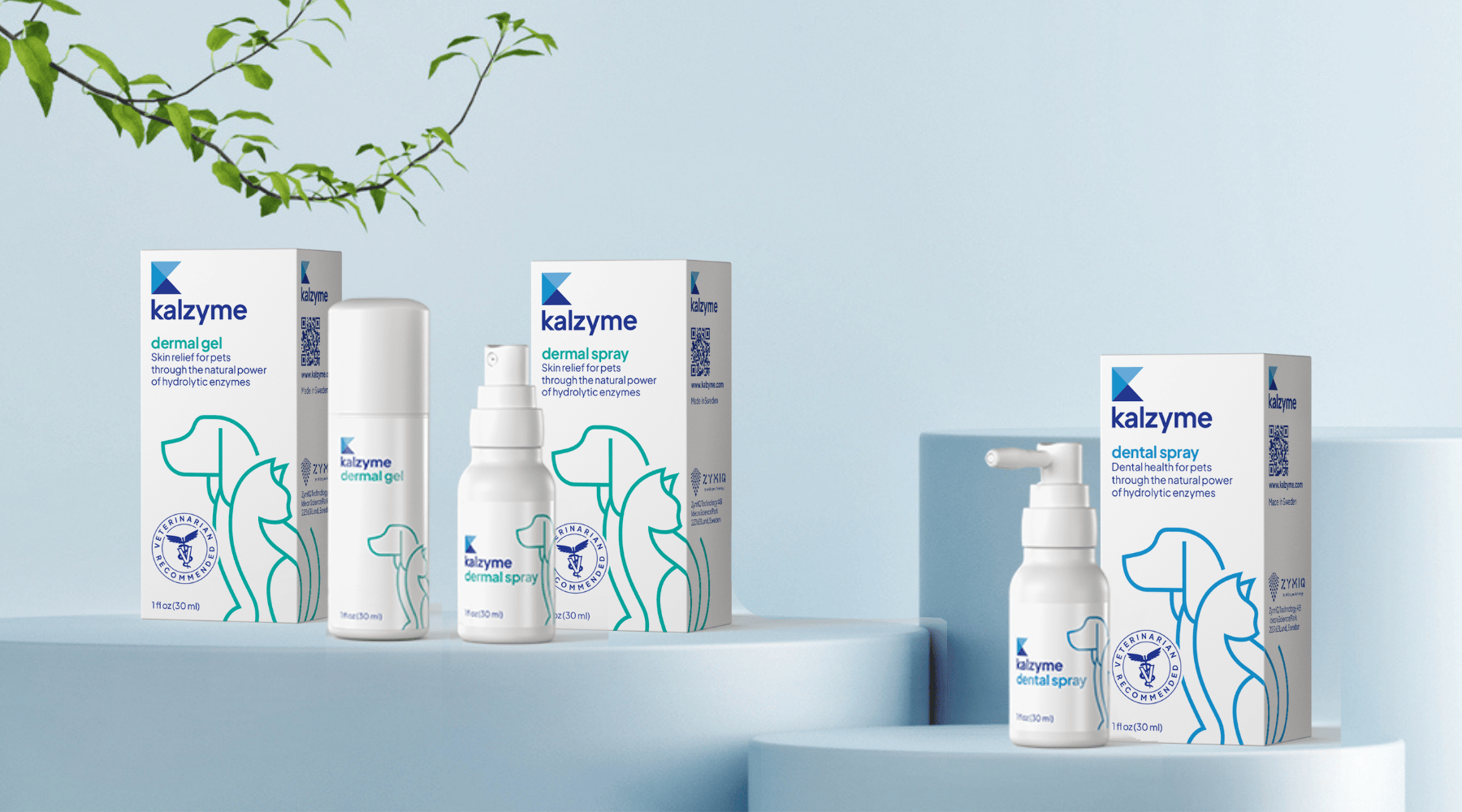 Kalzyme Dermal Gel and Spray create an active barrier to reduce microbial adhesion on damaged skin, while also exfoliating, moisturizing, and soothing irritations (itching and chewing) in the affected area.