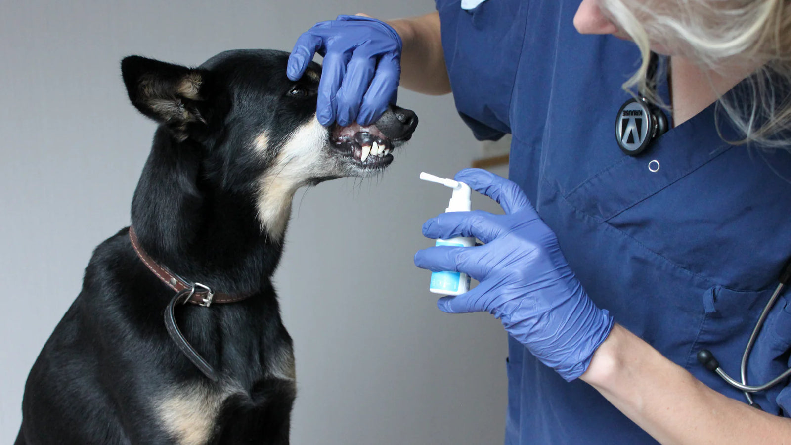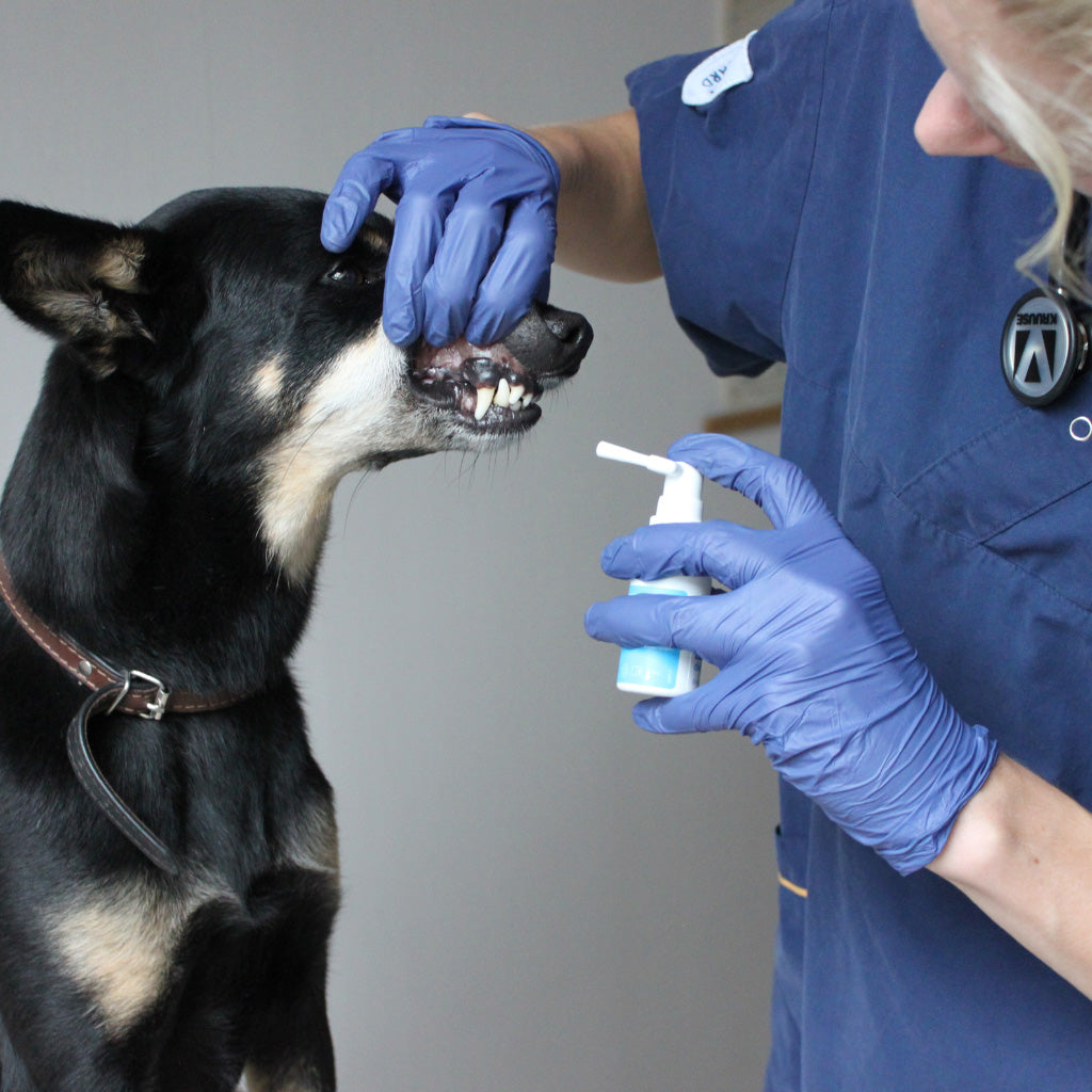 Gently lift the upper lip of the animal with one hand. Hold the spray nozzle 2-5 cm away from the animal's teeth and gums, and spray gently over the entire teeth and gum area.